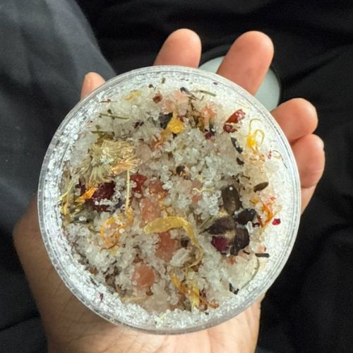 Indulge in the ultimate relaxation experience with our Bath Salt Soak. Let the stress of the day melt away as you submerge yourself into a warm bath filled with a luxurious blend of Mediterranean Sea Salt, Pink Himalayan Salts and Dead Sea salt infused with the soothing essence of arnica oil and flowers rose oil and buds, and Lavender, peppermint, and other essential oils creating a symphony of calming aromas that fill your senses.